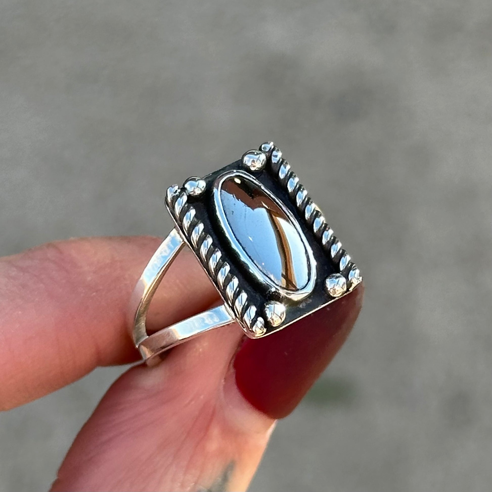 Hand forged using sterling silver and the super rare Mohawkite stone from the long-closed Mohawkite mine in Michigan. This mine has been closed for over 100 years and with each year, this material becomes harder and harder to find. Filed to make a spiked border. Stamped with my maker’s mark and .925 to indicate sterling silver.