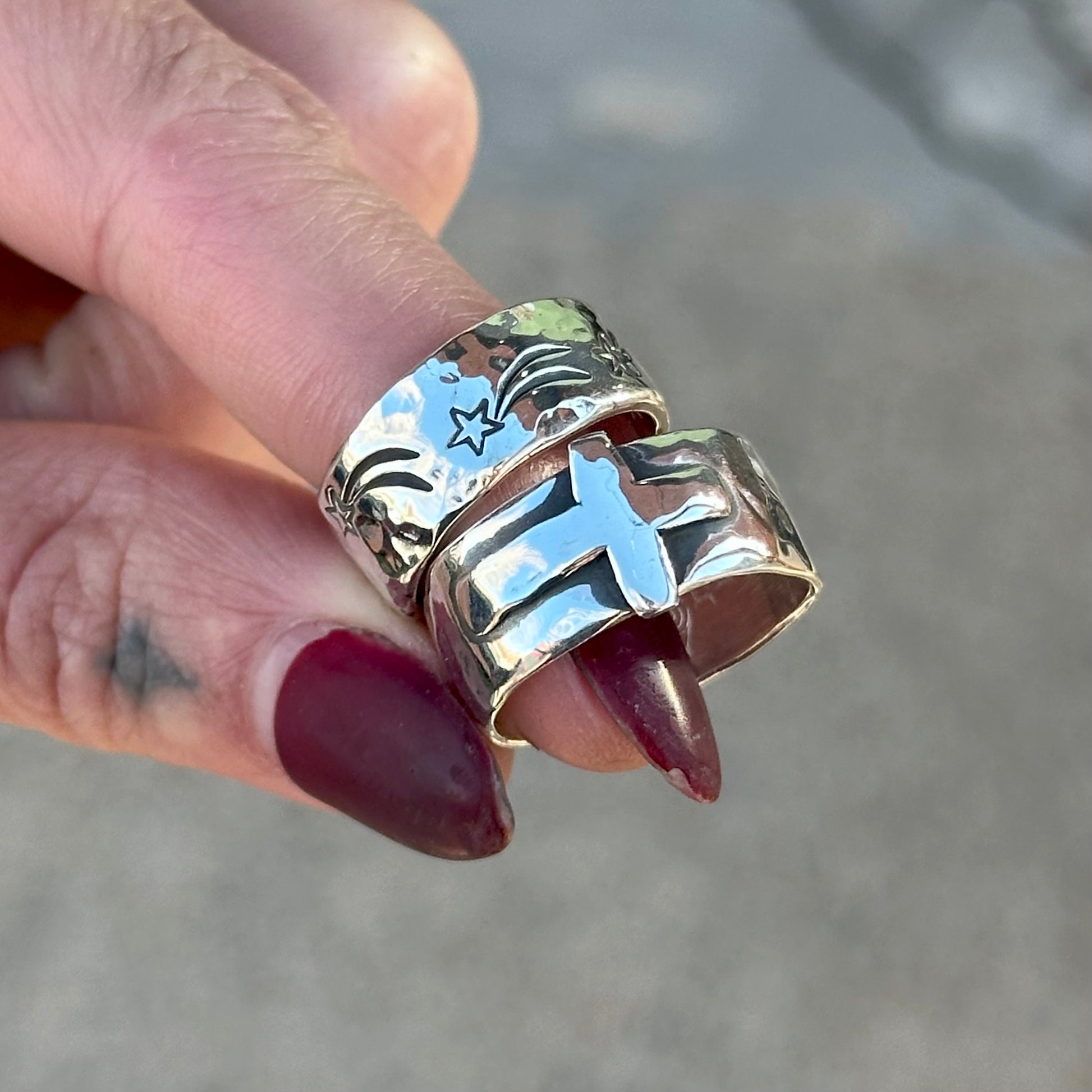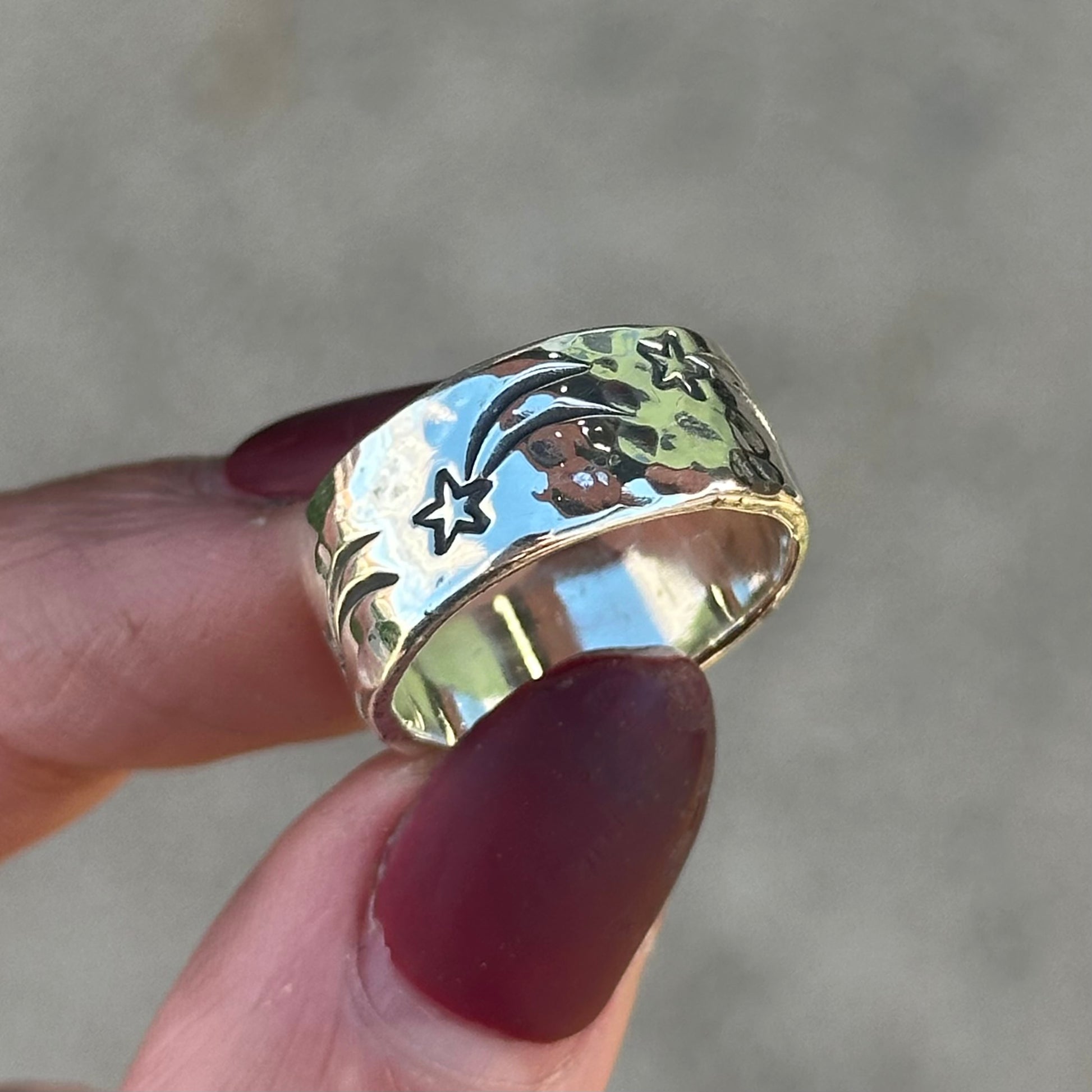 Shooting stars on a thick 8mm wide sterling silver band. Finished with a hammered texture, stamped with my maker’s mark and .925 to indicate sterling silver.